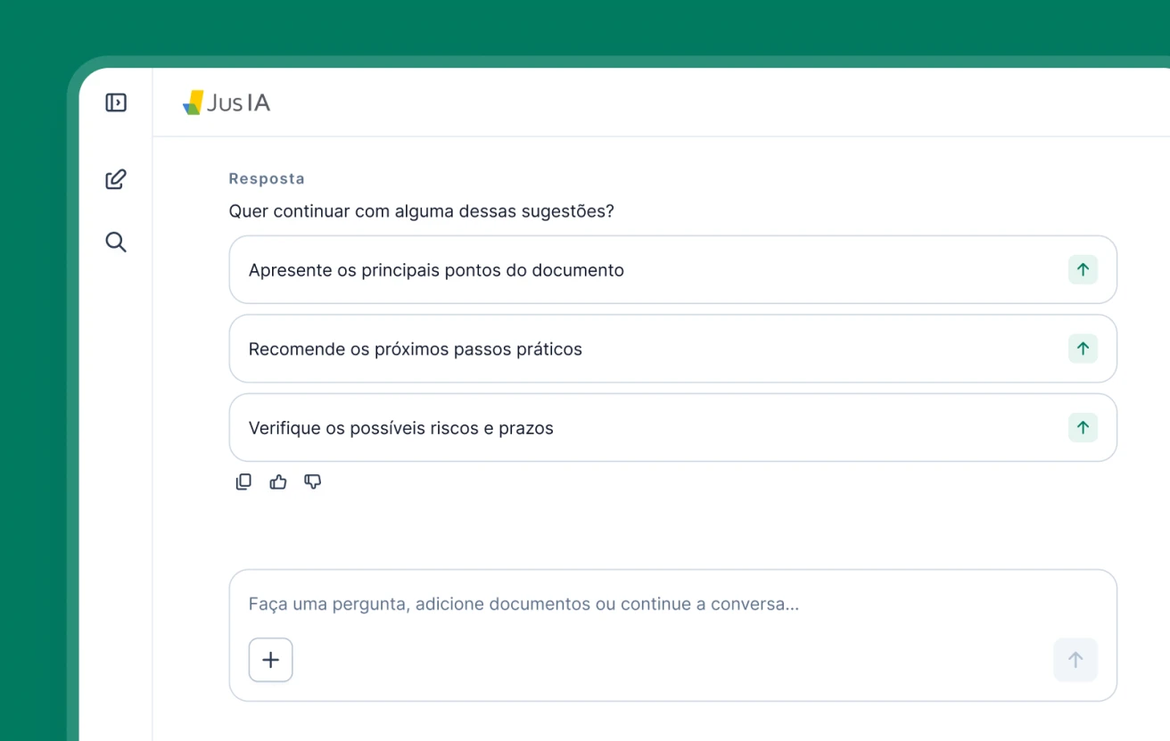 Na prática jurídica, cada decisão conta e o Jus IA dá mais um passo para estar ao seu lado nesse momento. Agora, além de interpretar documentos, o assistente sugere possíveis caminhos a seguir, ajudando você a manter sua estratégia processual sempre em movimento.