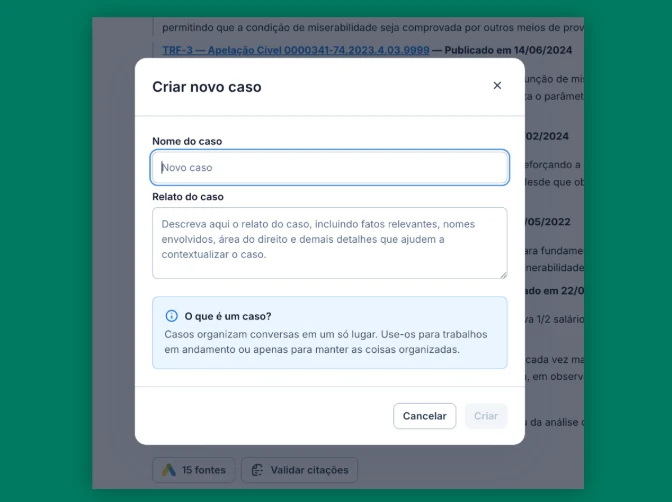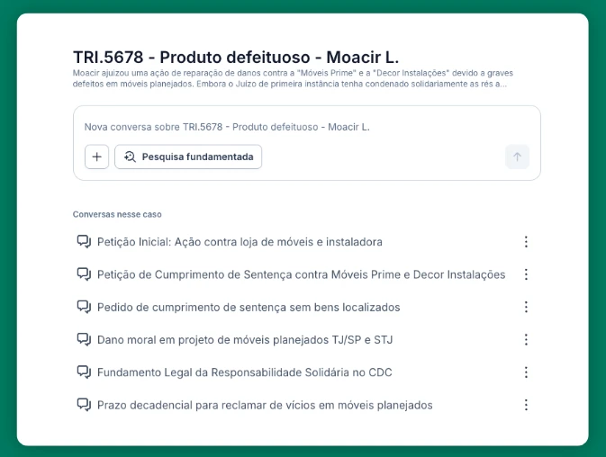 Exemplo: se você criou um Caso para “Ação de Indenização contra Construtora”, todas as novas conversas dentro desse Caso já saberão que se trata dessa ação específica — sem precisar explicar novamente.
