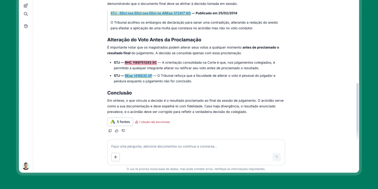 Veja, na prática, como o Jus IA confere automaticamente cada citação jurídica: