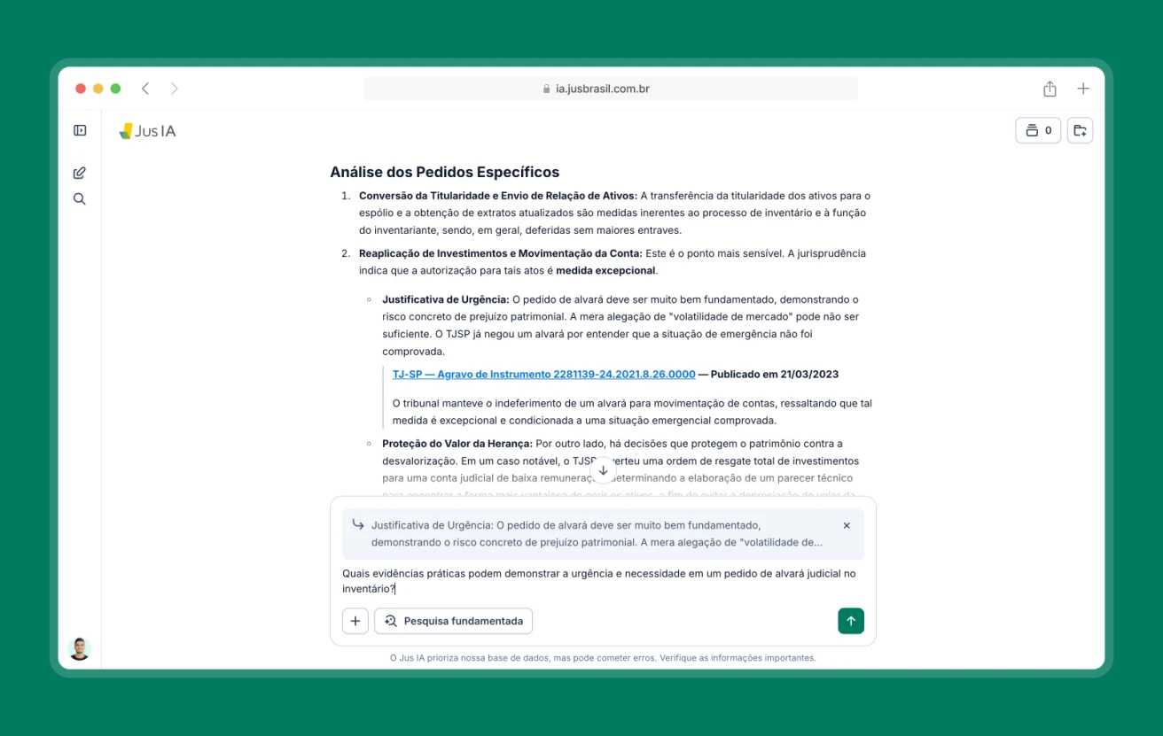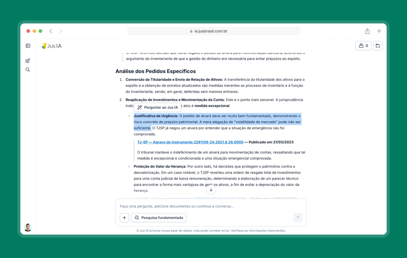 Pensando nisso, o Jus IA acaba de ganhar uma funcionalidade que transforma esse momento de ajuste, revisão e aprofundamento: o “Perguntar ao Jus IA”. Com essa funcionalidade, você pode selecionar qualquer trecho da resposta do assistente e continuar a conversa diretamente a partir dali — sem precisar copiar e colar ou explicar tudo de novo. Um avanço importante para quem busca mais eficiência, precisão e controle durante o uso do Jus IA.